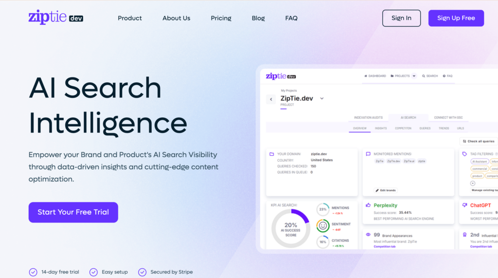 ZipTie is a performance monitoring and diagnostic platform specifically built for the Generative AI Search era. Unlike legacy tools that focus on keyword rankings and backlink profiles, ZipTie scans AI search engines to see if a brand is mentioned, how it is described, and which specific pages are being used as citations. It is essentially an “audit” tool for the AI’s memory.
