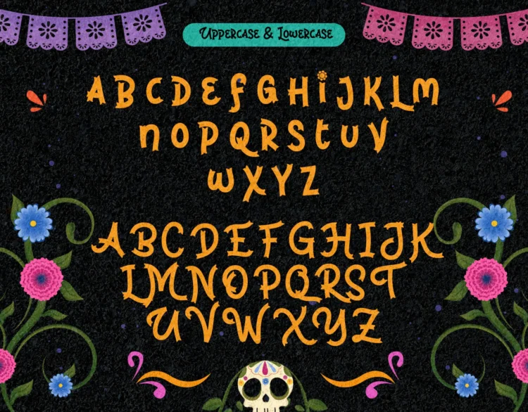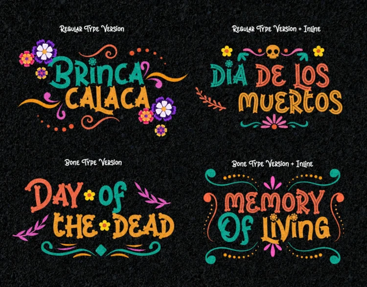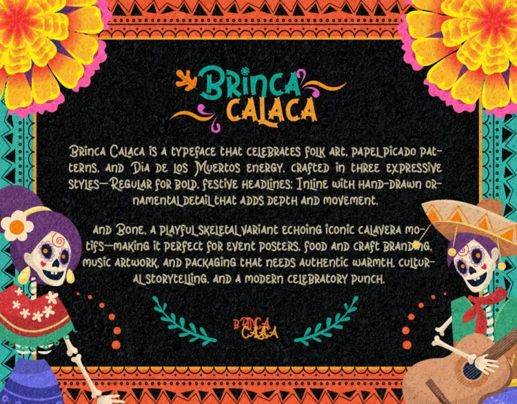 Brinca Calaca is a vibrant Hispanic font family inspired by Dia de los Muertos, featuring bone-styled glyphs, festive ornaments, and a joyful Latin spirit. With Regular, Inline, and Bone variants, this playful display font is perfect for holiday posters, cultural branding, and themed events that need bold personality and handcrafted charm.