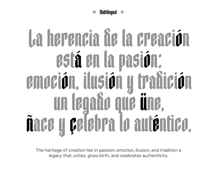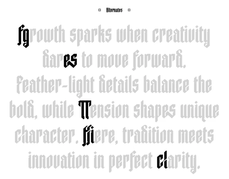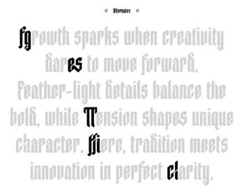 Caelum is a modern blackletter typeface designed with a minimalist twist. Combining the bold spirit of gothic calligraphy with clean, geometric cuts, Caelum delivers a sharp and futuristic edge while maintaining strong legibility. Each letterform is crafted to evoke power, clarity, and tension—perfectly suited for projects that demand attitude, bold identity, or an avant-garde touch.