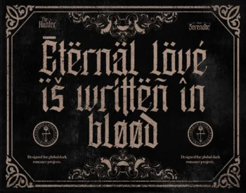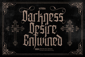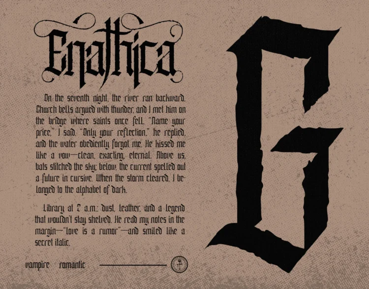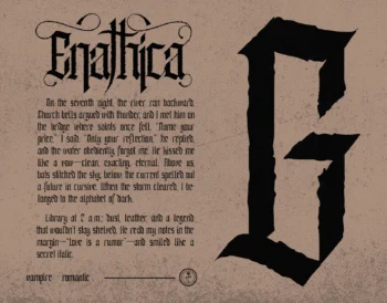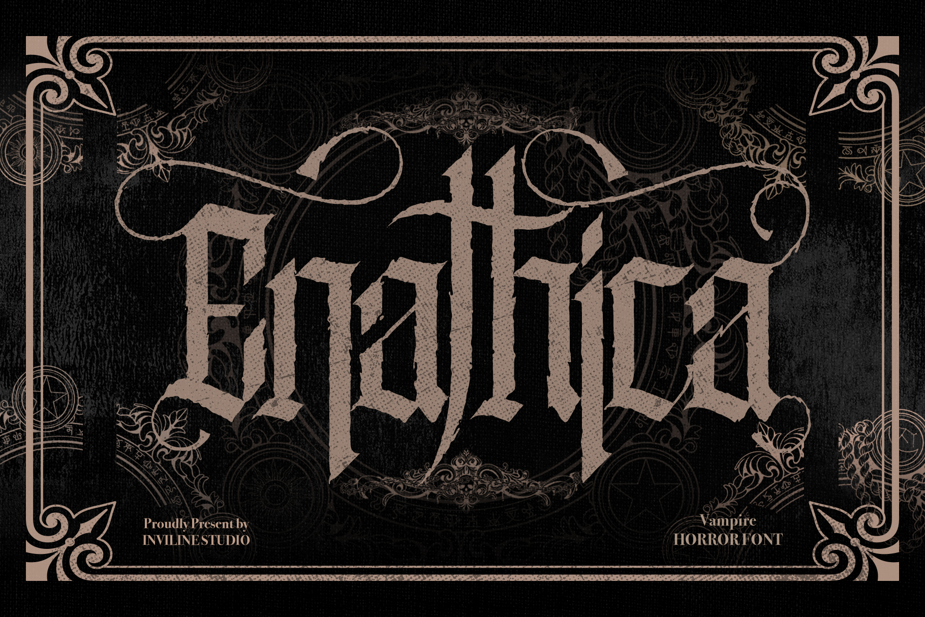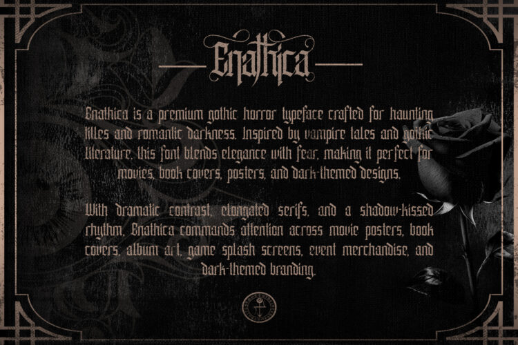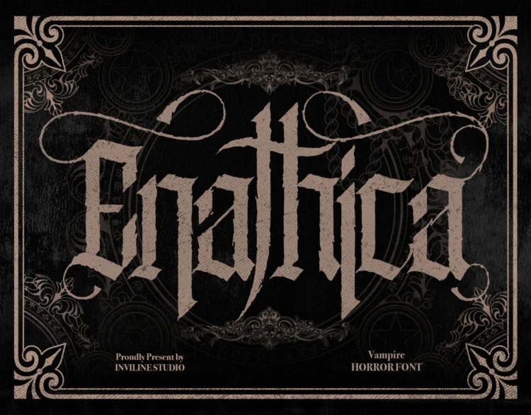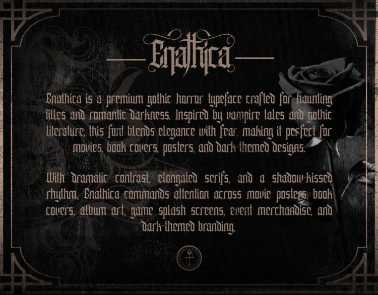 Enathica is a bold and haunting vampire horror font that evokes the eerie elegance of gothic romance and classic horror. Crafted with sharp blackletter-inspired strokes and ornamental swashes, it delivers a spine-chilling aesthetic that is both timeless and theatrical. This font offers uppercase, lowercase, ligatures, alternates, symbols, punctuation, and numerals—making it ideal for creative professionals who want to inject dramatic flair into their designs. Whether you’re a vampire-themed book cover, metal band logo, occult merchandise, or Halloween posters, Enathica is your perfect typeface for storytelling in darkness and desire.