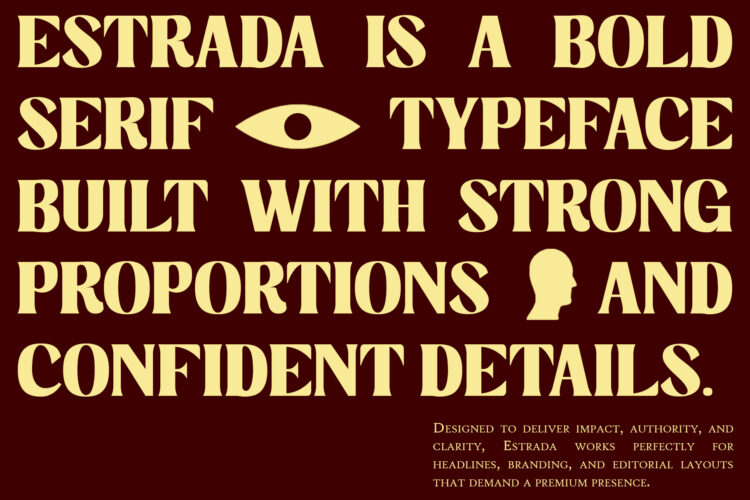 Estrada is a bold serif display font with strong proportions, elegant alternates, and powerful ligatures. Designed for clarity and impact, Estrada brings sophistication to headlines, branding, and editorial work. With its confident letterforms and OpenType features, Estrada is ideal for premium visuals and timeless layouts. Add bold personality and refinement to your next design project with Estrada.