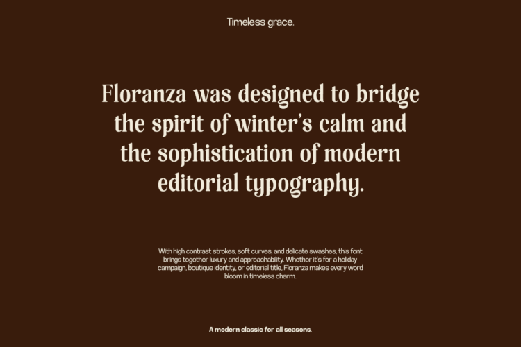 Floranza is a luxury high-contrast serif font designed to bring timeless elegance and winter charm into editorial design. With expressive swashes and soft curves, it’s perfect for boutique branding, holiday campaigns, and sophisticated typography lovers who seek warmth and grace in every word.