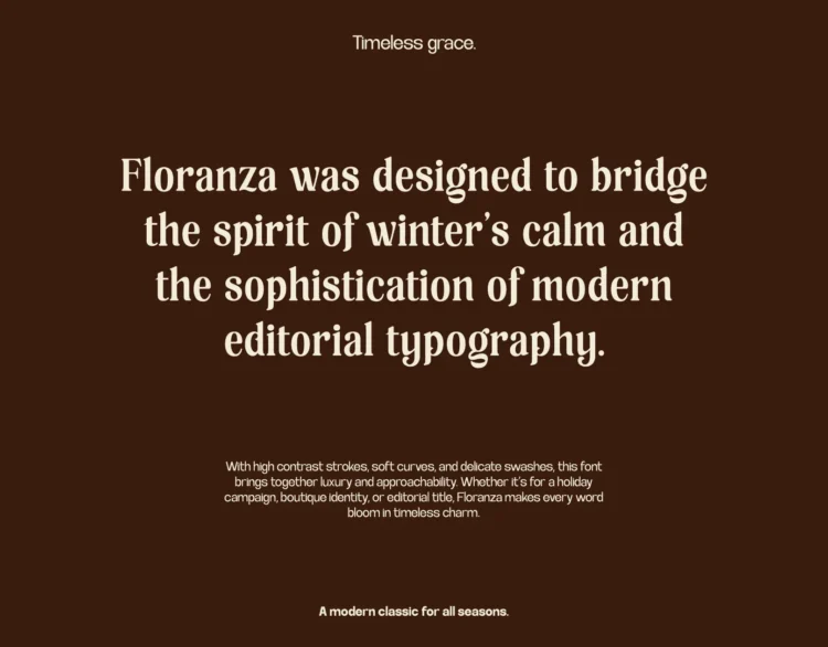 Floranza is a luxury high-contrast serif font designed to bring timeless elegance and winter charm into editorial design. With expressive swashes and soft curves, it’s perfect for boutique branding, holiday campaigns, and sophisticated typography lovers who seek warmth and grace in every word.