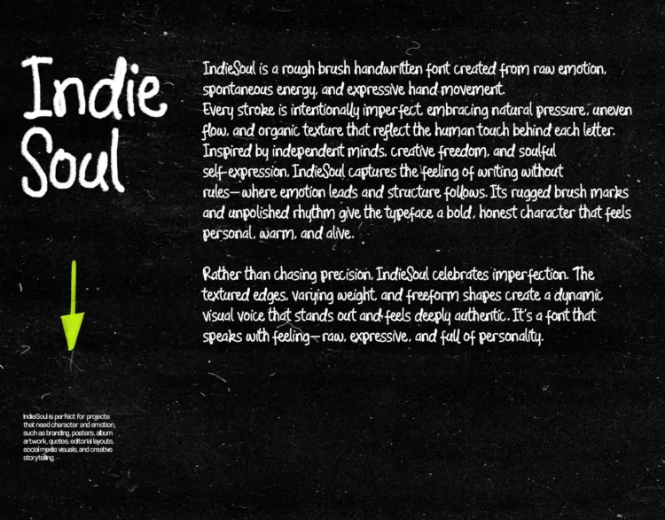 IndieSoul is a rough brush handwritten font born from raw emotion and untamed expression, capturing the feeling of writing without overthinking where instinct leads and structure follows.