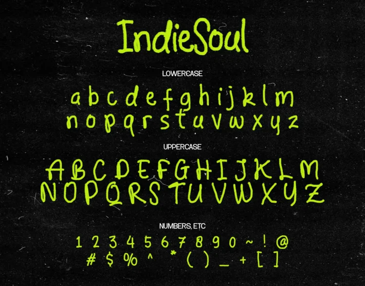 Each letter carries textured strokes, visible pressure, and an intentionally imperfect rhythm that feels organic, personal, and alive. With expressive uppercase and lowercase characters, numbers, and essential punctuation, IndieSoul delivers a bold yet intimate visual voice that celebrates imperfection rather than precision. Perfect for posters, album artwork, branding, editorials, quotes, and storytelling projects, this typeface brings honest energy, soulful character, and raw personality to every word it shapes.