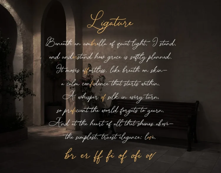 Luminary is a soft, elegant script that lives between quiet confidence and timeless beauty. It blends flowing, graceful strokes with clean structure, creating a refined rhythm that feels effortless yet intentional. The letters move naturally, forming smooth connections and delicate curves that bring warmth without overwhelming the eye. The mood is romantic, polished, and gently luminous like light touching silk. Luminary works beautifully for wedding invitations, luxury branding, perfume labels, editorials, packaging, and poetic layouts where elegance needs to feel sincere rather than dramatic. Designed to feel refined, but stay personal.