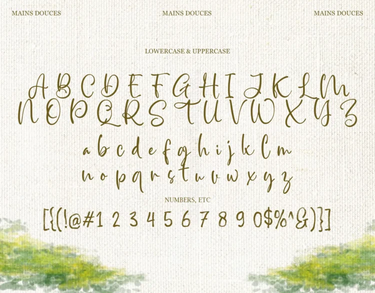 Each character feels graceful and organic, balancing elegance with authenticity—never forced, never rigid. Designed to bring calm emotion and subtle charm to your typography, Mains Douces is perfect for branding, wedding stationery, editorials, packaging, quotes, and creative projects that seek softness, intimacy, and refined handwritten beauty.
