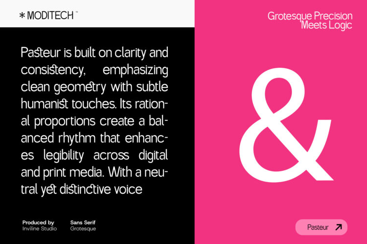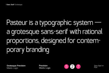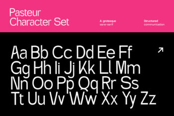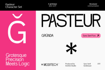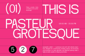 Pasteur is a modern grotesk sans serif typeface crafted for structured communication and sharp clarity. Designed by Inviline Studio, Pasteur blends geometric precision with a logical structure, making it perfect for branding, editorial, UI design, and signage. With clean curves and consistent proportions, this font excels in legibility and contemporary style. Featuring uppercase, lowercase, multilingual support, and a full set of numerals and symbols, Pasteur delivers versatility for both digital and print use. Its bold aesthetic adds a sense of modern sophistication to every project.