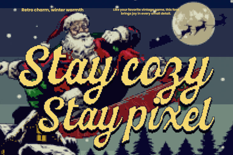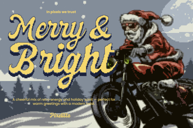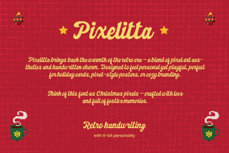 Pixelitta is a retro pixel script font inspired by holiday charm and 8-bit aesthetics. It blends nostalgic handwritten strokes with pixelated edges, making it perfect for Christmas cards, winter event posters, pixel games, and festive branding. Designed to radiate warmth, joy, and playfulness ideal for any creative project that craves retro flair with a modern twist.