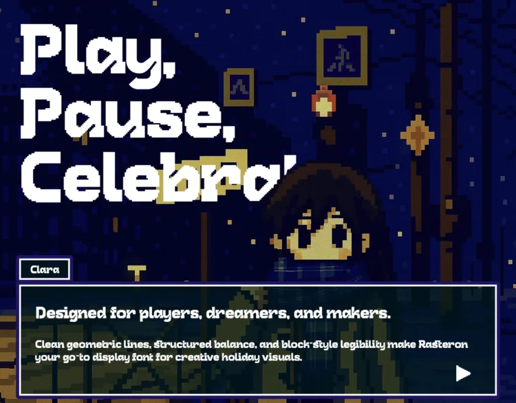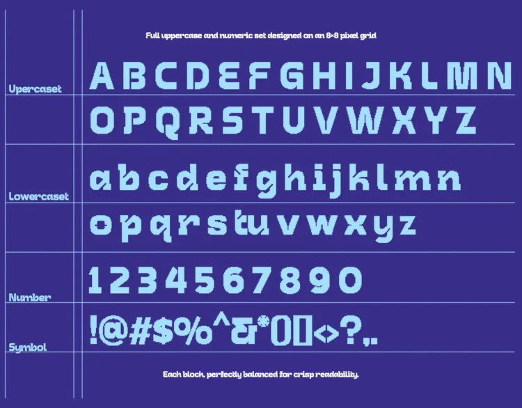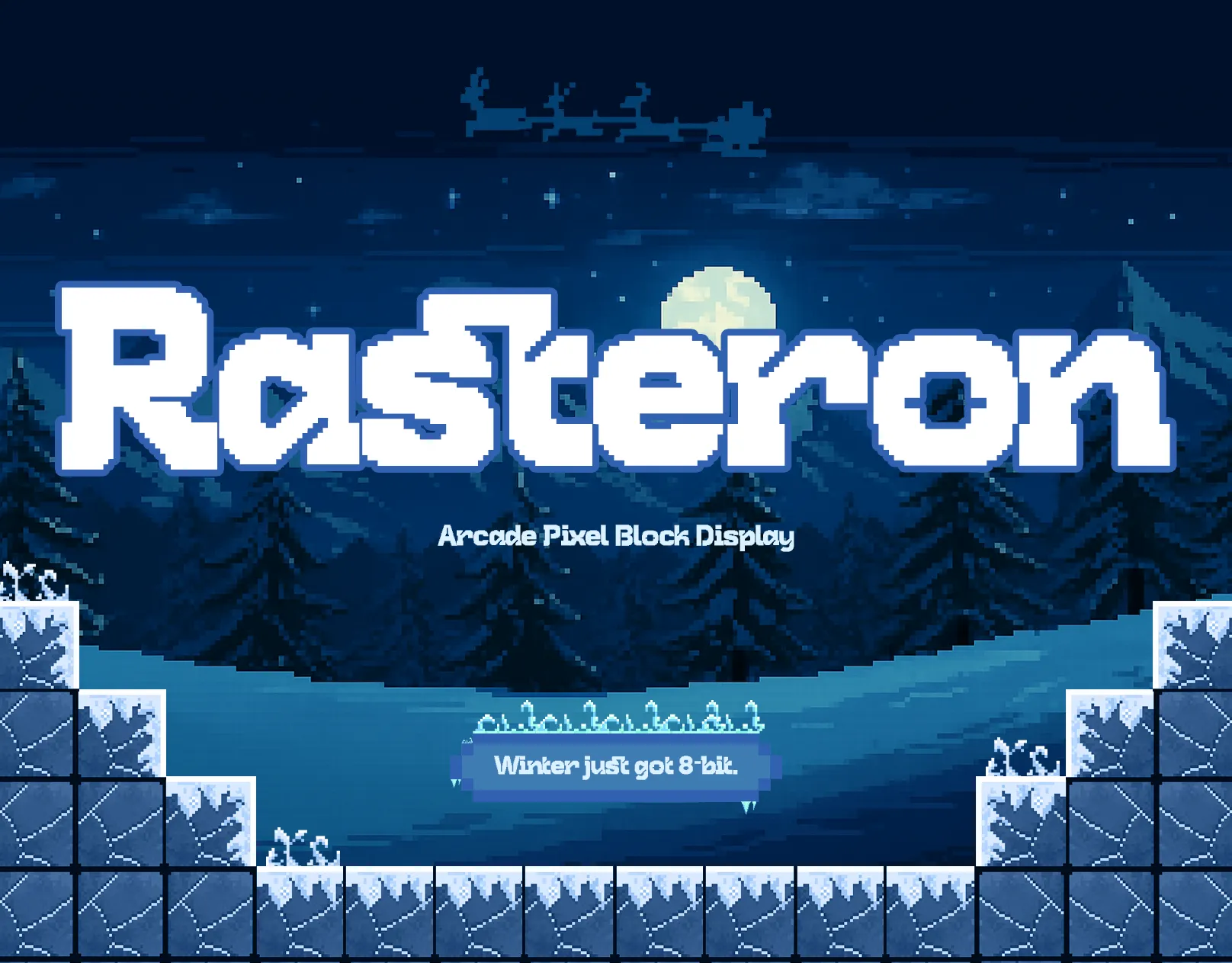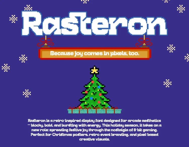 Rasteron is a retro arcade-inspired pixel display font that brings festive energy to your creative projects. Crafted on an 8×8 grid, its bold blocky style offers nostalgic charm with modern legibility. Perfect for pixel art, video game graphics, posters, Christmas packaging, and retro branding. Rasteron turns celebration into 8-bit style with clean geometry and joyful energy. Let your winter designs level up with pixel-perfect vibes.