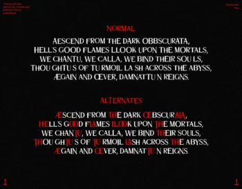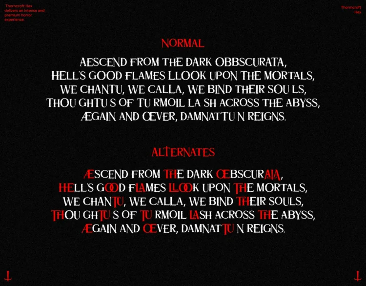 Thorncroft Hex is a haunting serif horror font crafted to channel dark magic, demonic lore, and vintage occultism into your typography. With rough, thorn-like edges and ritualistic alternate glyphs, this font conjures a chilling atmosphere straight from a cursed manuscript or supernatural thriller.